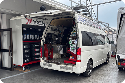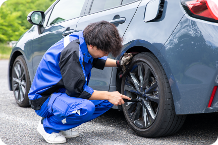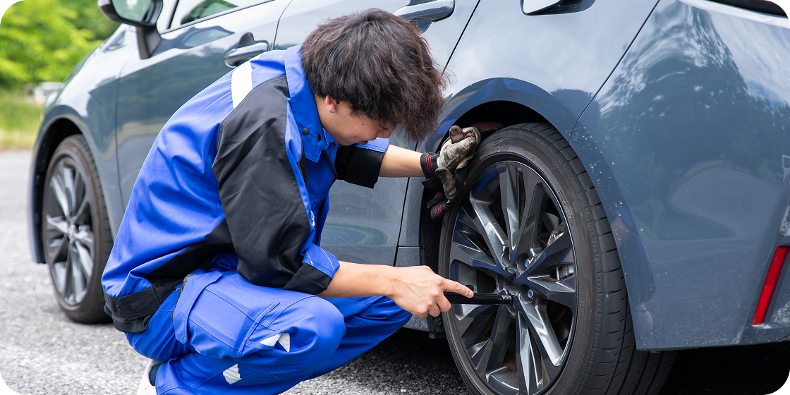 出張サービスでは、ご自宅や職場、現場にいながらタイヤ交換が可能です。専用機材を搭載したサービスカーで伺い、店舗と同等の精度で作業を行います。お客様の大切な時間を無駄にしない迅速かつ丁寧なサービスを提供いたします。